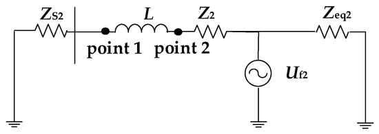 After collecting steady-state fault data, switch Q may be opened in preparation for maintenance. The symmetrical component method is used to analyze the post-protection steady-state fault information. When other types of faults occur (i.e., other than single-phase earth faults), the power supply remains operational. The inclusion of additional inductance can cause a significant fault current in the line due to other faults, but it also helps to limit this fault current. The positive and negative-sequence electrical quantities (voltage and current) from the three-phase line provide clear indications of significant fault information. In the event of a single-phase earth fault, the inductance’s inclusion allows the single power supply to continue operating, with a relatively low fault current flowing into the fault point. The power supply remains within the positive-sequence network, facilitating effective measurement of the faulted phase’s positive-sequence electrical quantities. Regarding the negative-sequence components, the equivalent negative-sequence network of the line is illustrated in Figure 2.