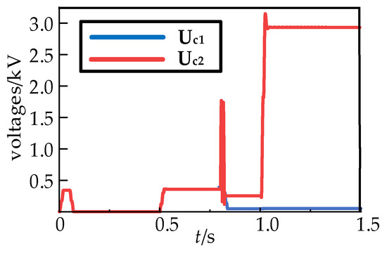 From Figure 6, it can be observed that, during normal operation, the amplitude of phase A current is 0.51 kA. At 0.5 s, a short circuit fault occurs, causing the A phase current to become 4.32 kA. At 0.8 s, circuit breaker QF opens, rapidly reducing the A phase current to 0. At 1.0 s, the auxiliary inductance is connected, and the current amplitude is 0.48 kA. Due to the auxiliary inductor, the short-circuit current is limited from 4.32 kA to 448 A. The negative-sequence voltages at measurement points 1 and 2 are shown in Figure 7.