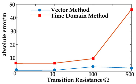 The fault distance measurement results under different fault types and distances using the vector method and time-domain method are presented in Table 2. In the table, AB represents a two-phase short circuit, ABC denotes a three-phase short circuit and G indicates a ground fault. The transient resistance in all cases is 10 Ω. The absolute error is expressed as Equation (13).