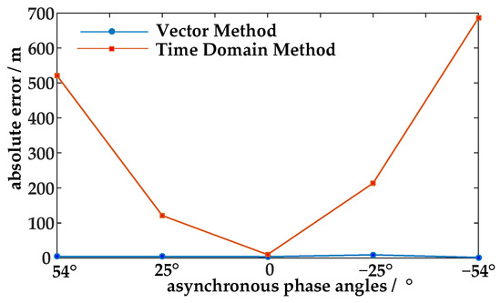 To ascertain the accuracy of the distance measurement method under a spectrum of asynchronous phase angles, the unsynchronized time is denoted by t. The equation for converting between unsynchronized time and asynchronous phase angle is given by Equation (15). In the simulation, when solving Equation (9), the voltages affected by asynchronization (e.g., UN1, UN2) can be multiplied by different asynchronous phase angle values to simulate the effect of time asynchronization. We consider the timing errors discussed earlier, which range from 1 to 3 ms, that correlate to an approximate asynchronous phase angle span of 0–54°.