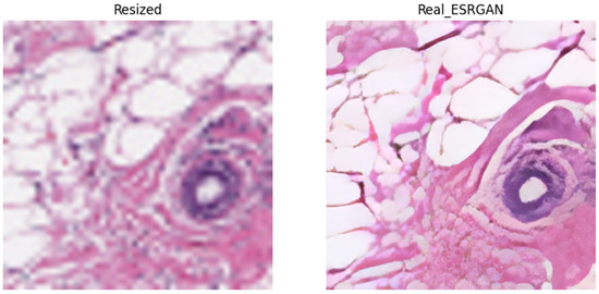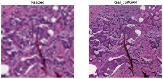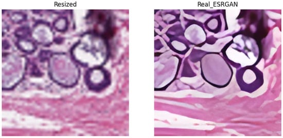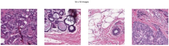 To provide a more suggestive visual qualitative analysis, we also applied the Real-ESRGAN to a breast histopathology dataset [35]. The original images are 50 × 50 pixels in size and show invasive ductal carcinoma pathology. If we would like to use this dataset for a task like semantic segmentation, it would be a very unpleasant and maybe impossible task to annotate the images at this size. A simple change of image size produces blurry results. In a scenario like this, it is observed that resolution enhanced images present a better quality. In Figure 6, four of the original images from the dataset are presented. In Figure 7, Figure 8, Figure 9 and Figure 10 we can see on the left the simple resized image and on the right the Real-ESRGAN enhanced image.
