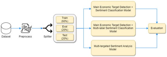 In this section, we present a summary of the material, methods, and proposed approach. Figure 1 shows the pipeline of this work. In summary, the process is as follows. First, we collected tweets from Spanish economists and digital newspapers by using the UMUCorpusClassifier tool [11]. Second, the corpus is preprocessed to normalize the text format. Third, the corpus is divided into training, validation, and test subsets in a 60-20-20 ratio. Fourth, to analyze sentiment for different targets in financial tweets, we experimented with three approaches: (i) fine-tuning pretrained models based on transformers for SA and MET entity detection, i.e., a sentiment classification model for each target and a MET detection model; (ii) a MET detection model and a multilabel classification model for different targets; and (iii) fine-tuning an encoder–decoder model for target extraction and SA for three targets. For each approach, we evaluated different pretrained models, both monolingual and multilingual. Finally, we performed an evaluation to select the best approach.