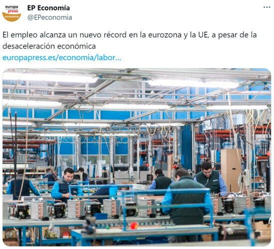 Example of a tweet of the Spanish MTSA 2023 corpus. The English text of this tweet is Employment reaches a new record high in the eurozone and the EU, despite the economic slowdown.