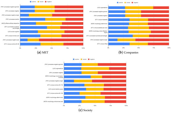 To analyze the dataset, we observe the information gain for each linguistic feature obtained with the UMUTextStats tool [12]. Figure 3a–c show the top ten normalized linguistic features for the MET, companies, and society, respectively. It can be observed that, regardless of the target, the presence of negative words is correlated with negative emotions, especially lexical items related to sadness and, to a lesser extent, to anger. However, in the case of documents labeled as positive, only positive words are strongly correlated with MET, but not with companies or society. In fact, we observed that the feature most correlated with positive documents is the percentage symbol for companies and the country lexicon for society. There are other features that are relevant for two of the targets, as it is the case of determiners, since we observed a correlation when the targets are other companies or society. Finally, we also observe that suffixes with an appropriate connotation are relevant for the MET.