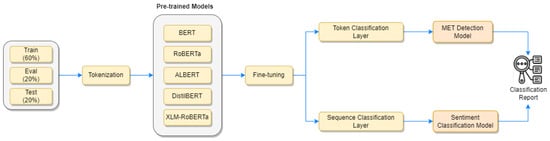 In this approach, we considered the problem of MET detection as a token classification task and SA as a multiclass classification task. In Figure 4, we can see the architecture of the system, and we proceeded to fine-tune different pretrained models by using the examples available in the dataset we collected.