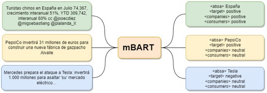 We based our approach on the REBEL framework [25], which uses mBART to extract entities and relationships from text. In this case, we used different seq2seq models such as mBART [26] and mT5 [27] as a base model and fine-tuned them to make the decoder generate the appropriate response, which in this case is the MET of the text and the sentiments of the respective targets.