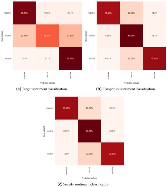 Using the confusion matrix, we can see that the model is not biased toward making serious mistakes, such as identifying a positive sentiment as a negative sentiment and vice versa. We can see that the model mislabels 9.36% of the negative and 8.27% of the positive texts for the entity target (see Figure 6a) and confuses neutral texts with positive ones at 27.39%. Regarding the prediction of sentiments for the companies entity, the model predicts 18.28% of the negative texts and 17.25% of the neutral texts. Regarding the prediction of the sentiments for the society target, we can see that it behaves similarly to the prediction of the companies sentiments, mistaking 17.59% of the negative texts and 20.12% of the positive texts as neutral.