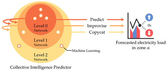 Generalized overview of a Collective Intelligence Predictor forming modular three-level forecasting networks to forecast the electricity load.