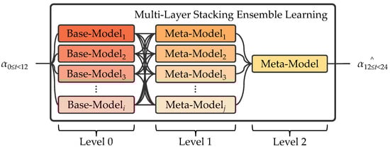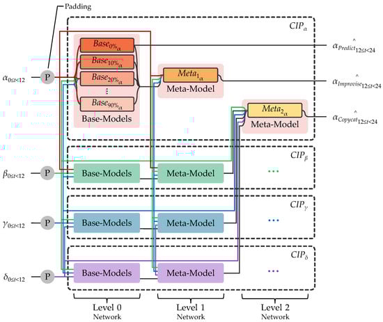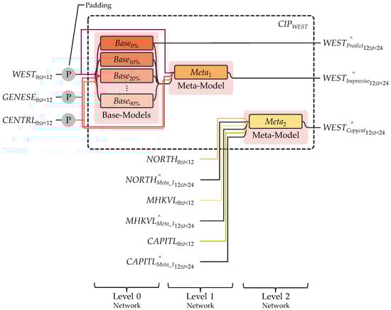 CIP takes inspiration to construct the networks from the multi-layer stacking ensemble learning. Stacking ensemble learning is a methodology to combine heterogenous base models to create a superior model compared to its components []. Compared to other ensemble techniques that use a deterministic way to combine the base models, stacking ensemble learning relies on a non-deterministic algorithm to combine the base models with a meta-model. Figure 6 shows the implementation example of a multi-layer stacking ensemble learning to forecast the electricity load in zone . A set of i base models that use different algorithms are implemented in Level 0 to add diversity in capturing different patterns in zone . In Level 1, a set of j meta-models combines the forecasting outcomes from the base models in Level 0 to improve the accuracy. In Level 2, a final meta-model refines the forecasts further by combining the output from the meta-models in Level 1. Most multi-layer stacking ensemble learning is limited to three layers, as the accuracy improvement greatly diminishes when adding a new layer.
