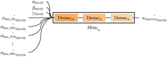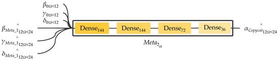 Similar to the in Level 1, the meta-model shown in Figure 11 uses a multivariable DNN model that utilizes TanH as the activation function in each dense layer. The only differences are the number of dense units in the first, second, third, and fourth layers, which are 144, 144, 72, and 36. With the assumption that electricity load zones , , and could reconstruct the electricity load forecast in zone , combines the forecasts with strong causality taken from the in Level 1 of , , and () together with the electricity load data corresponding to the zones other CIPs are assigned () to reconstruct the electricity load forecast in zone as . As redundancy is necessary for reconstruction, uses Granger causality to avoid selecting the same data chosen by the Kendall rank correlation coefficient used in Level 0 and Level 1 networks.