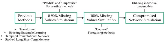 The most commonly used models to forecast the electricity load rely on the Recurrent Neural Networks (RNN)-based implementation and its derivatives, such as long short-term memory (LSTM) and Gated Recurrent Unit (GRU), due to their capability to capture long-term dependencies in sequential data with high accuracy []. In addition, the advancement of technologies and techniques in ANN brings new model architectures that show promising results in forecasting the electricity load. For example, forecasting models that rely on temporal convolutional network architecture (TCN) can capture the local dependencies in the data via convolutional layers, which contributes to shorter interfacing time when compared to the RNN-based derivatives [,]. As well as TCN, forecasting models that rely on Transformer architecture show parallelization capabilities when compared to the RNN-based derivatives with the implementation of attention mechanism to capture the relationships between the elements in the sequential data [,]. However, they share issues mentioned in Section 1, where the forecasting models that rely on RNN-based derivatives, TCN, and Transformer cannot directly handle the MV due to packet loss from the DDoS attack without relying on some form of imputation, masking, and padding.