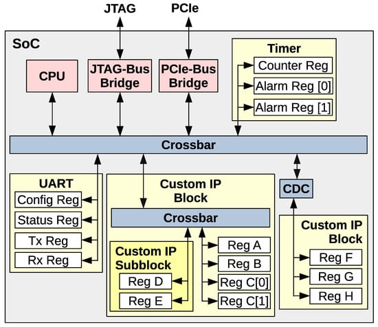 Managing the bus in a complex system is a nontrivial and well-known problem, especially in hardware–software codesign projects [3,4,5,6,7,8]. Even though various approaches and implementations have already been proposed, there is still no solution that would fully automate the bus management process. All available standards and tools only support some of the logical elements of bus management or require users to do the register management manually. The register management is the most error-prone and time-consuming part of the bus management. What is more, when the register logic is not fully automatically generated, there is a need to verify the behavior of the registers. This is usually conducted in simulation by directed or randomized test benches, although [9] presents the benefits of doing register verification using formal methods, and [10] shows an example implementation of this idea.