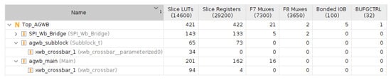 The number of utilized registers was the same for AGWB and FBDL. This was expected as the number of required registers depends on the total number of data bits, and both approaches describe the same data, but use different approaches. The number of utilized registers was higher than the number of data bits because some registers were utilized for the bus logic. However, as the same bus and VHDL library were used in both examples, the number of registers utilized by the bus logic was the same.