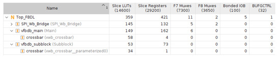 Hardware descriptions generated by the register-centric AGWB and the functionality-centric FBDL approaches were synthesized to compare resource utilization and show that the functionality-centric approach is not only a theoretical concept but also something that works in practice. Vivado 2021.2 was used as the synthesis tool. The Synthesis Strategy was set to Default, and the -flatten_hierarchy property was set to none. The target part was xc7s25ftgb196-1Q (Spartan 7).