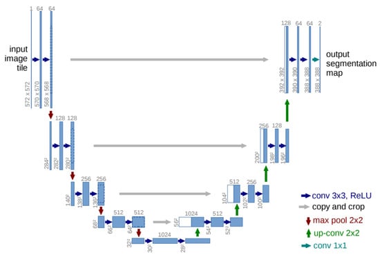 U-Net architecture (extracted from [6]). Each blue box represents a feature map with multiple channels, and the number of channels is indicated on top of the box. The x–y size of the feature map is provided at the lower left edge of the box. White boxes indicate copied feature maps, while the arrows indicate the various operations performed.