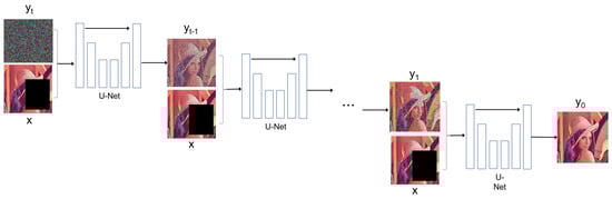 Figure 3 graphically shows the workflow of the inference process, which is a reverse Markovian process that starts with a pure Gaussian noise image and a condition image x (the target image with a missing region in the inpainting task) and iteratively performs a conditional denoising with the U-Net model .