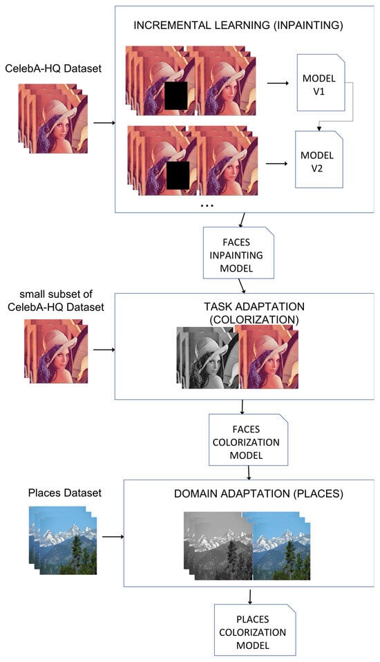 In this study, we focus on the drawbacks associated with utilizing a multi-task generalist approach for image-to-image translation. While this approach offers versatility, it is important to consider its potential limitations. In certain scenarios, employing a specialized model tailored specifically to a given task may yield superior performance compared to a generalist model. Moreover, the training process of the generalist model necessitates significant computational resources and extensive datasets, thus presenting challenges in terms of feasibility and accessibility for potential developers [19]. Through the examination of the advantages and limitations of employing a multi-task generalist approach for image-to-image translation, this paper provides a practical approach that requires an easier and computationally lighter training process. Figure 4 provides a graphical overview of the methodology. First, a base model for human face inpainting is trained from scratch with an incremental learning strategy. Second, the base model is fine-tuned to perform a different task, image colorization. The resulting colorization model is, in turn, fine-tuned to operate in a different domain, landscape images.