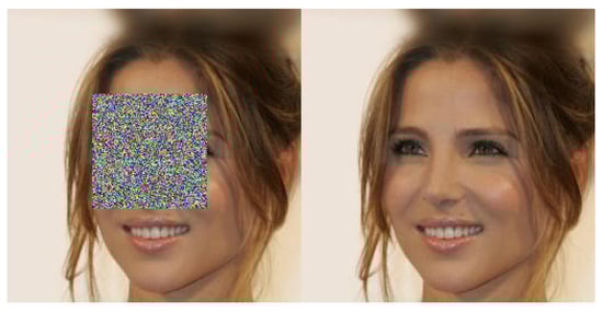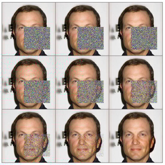 - Lugmayr, A.; Danelljan, M.; Romero, A.; Yu, F.; Timofte, R.; Van Gool, L. Repaint: Inpainting using denoising diffusion probabilistic models. In Proceedings of the IEEE/CVF Conference on Computer Vision and Pattern Recognition, New Orleans, LA, USA, 18–24 June 2022; pp. 11461–11471. [Google Scholar]