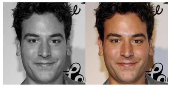 During the present stage, the model was provided with input data consisting of the original images altered by an incorporated square mask centered in a random point close to the center of the image, effectively occluding an area encompassing approximately one-fourth of the total image dimensions. Moreover, the mask consisted of random Gaussian noise. This approach ensured that the model would encounter a consistent and controlled input configuration, allowing it to focus specifically on the task of handling the masked region and generating accurate inpainting results. An example of the ground truth and the masked image is shown in Figure 5. This was modified to fit the new colorization task. The mask was no longer applied, and the image was converted to a gray-level scale. A relevant detail to highlight here is that DMs are known for keeping the same dimensionality of the data throughout the whole process, working with samples of size 256 × 256 and 3 channels as we worked with colored images. When obtaining the gray-scale image, we were cutting down the number of channels from three to one, which did not suit the architecture anymore. To solve this, the input to the model was adapted, obtaining the 1-channel grayscale image and passing it to a 3-channel image by having all three channels be the same. In Figure 6, we see the new input and ground truth images given to the model to train the new task.