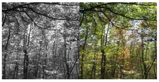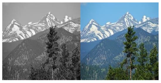 Loading the previously trained model for face colorization, we retrained the model, this time feeding the Places-2 dataset’s images as input but converted to a gray-level scale. Figure 7 and Figure 8 show examples of the data fed for this experiment. Places-2 [22] has a high number of subsets of images featuring different kinds of places. In this experiment, only images from the folders ’Mountain’ and ’Forest’ were considered. We chose these images because they held some similarities, but we still had data from more than one class, increasing the generalization capabilities of our model. For the training, the images were treated the same way as in previous experiments. With only 25–30 epochs, the model already reached excellent results, showcasing an extremely short training period compared to the one needed when training a model from scratch.