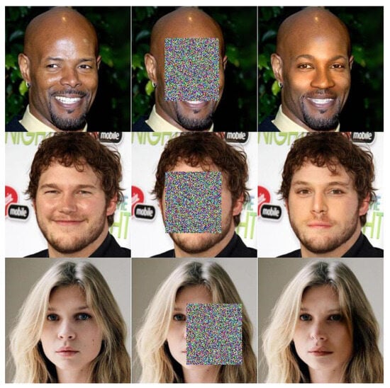 The base model aims to generate visually plausible and contextually coherent missing regions within the images. The utilization of the CelebA-HQ dataset during the training for this task enables the model to learn from diverse examples of human faces, thereby facilitating the acquisition of facial attributes, color patterns, and spatial relationships, very useful features that can be exploited in other tasks and applications. The base DM architecture was obtained from an existing unofficial implementation of Palette [21], which was later modified and tuned to fit this work’s scope. The existing code held all four Palette modules (colorization, inpainting, uncropping, and JPEG restoration), although only inpainting and uncropping were functional. Moreover, this first step’s goal consisted solely of image inpainting. There were some pre-trained inpainting models that were used for the early steps of the project, but in the end, a long-trained model focused on inpainting was trained from scratch. The software in charge of this task was already built [21], with small changes required, but hyperparameter optimization was required to obtain better results, especially adjusting to training time restrictions. The code required a long training time (as expected) and required GPUs to run it. Because of this, we had to handle the parameters of the model to minimize the running time but keep a healthy balance so good results were still obtained. Initially, the model consisted of 2000 timesteps, which means that it added noise 2000 times and was denoised another 2000 times. We reduced the number of steps to 1200, as we experimentally found that quality results were still achieved while minimizing the timesteps. Also, to compensate for this modification, we proportionally increased the noise addition to end up with the same amount of distortion at the end of the Markov chain, passing from 0.9999 of maintained information between timesteps to 0.9983. It is worth mentioning that the limitation to the number of images per epoch fed to the model was one of the biggest factors that helped reduce the runtime, but this hyperparameter adjustment provided an extra speed-up.