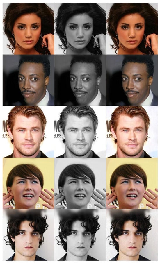 Furthermore, we present visual representations of the generated outputs in Figure 12 for qualitative evaluation. Our colorization model demonstrates impressive performance on the CelebA-HQ faces dataset. The generated results exhibit excellent colorization not only on the facial features but also on the background of the images. It is noteworthy that colorizing the background accurately proved challenging during the initial stages of the training process. However, our model successfully overcame these difficulties and now produces remarkable colorization results across the entire image.