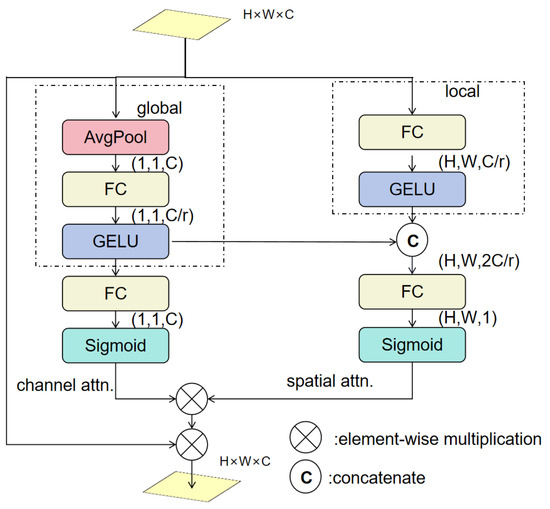 To take advantage of Transformer’s large receptive field, our network adopts the SWin-Transformer block for a long-range context information extraction. Due to Swin-Transformer’s window-partitioned self-attention mechanism, resulting in its linear computation cost with respect to the input feature size, it is possible for us to choose it to apply global feature extraction in a lightweight model. As the first thirteen layers of GhostNet have enough depth, the input fused features at different scales have been compressed thoroughly. We only use one Swin-Transformer block for long-range dependency information extraction. Even so, the Transformer block would still consume more computational cost, and the increased memory occupation would not be neglected when compared to a convolutional structure. For this reason, the channels of the input feature to the Transformer block often remain at a minimal level for most lightweight networks with a Transformer structure. Here, we adopt a point-wise convolution to decrease channel numbers from 1008 to 128 with batch normalization to avoid vanishing gradient. The channel downscale ratio is close to 1/8; it would alleviate the computation burden to such a ratio since the computation cost of Swin-Transformer is in proportion to channel size. Since the feed-forward network (FFN) in the Transformer block serves as the only non-linear component, it plays an important role in modeling non-linear relationship [46]. We must fully exert its modeling ability and compensate for its shortcomings. Although non-linear activation is usually conducted on enlarged channel dimensions produced by a linear layer, it is still insufficient in lightweight models due to parameter constraints. Furthermore, the plain FFN model cannot model spatial dependency very effectively because it has drawbacks of modeling at the spatial level [46]. To overcome such drawbacks, we adopt the bi-dimensional attention feed-forward network originating from LightViT. The bi-dimensional attention model is shown in Figure 2, “r” denotes reduction ration. It consists of a channel attention branch and a spatial attention branch: the channel attention branch aggregates the global representation with an average pooling layer, which is used to compress global features for computing channel attention; and the spatial attention is particularly designed to enhance its spatial modeling ability. Just before the spatial attention, a concatenating operation would be used to model the pixel-wise relation. Finally, the interaction between channel attention and spatial attention promotes the information flow between channels and global space.