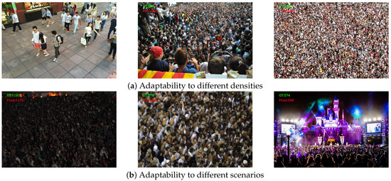 To further evaluate the robustness of our model to different scenarios, we display the prediction results in Figure 4. The first row validates the adaptability to different densities. The images in the first row exhibit a range of density variations, from relatively sparse to extremely dense. Then, The images in the second row demonstrate a wide variation in illumination, with the last image exhibiting strong light pollution. Furthermore, all the images in Figure 4 can represent scenarios with different perspectives and varied conditions. The discrepancy between the ground truth value and the prediction value indicates that our model can achieve good performance under various challenging circumstances.