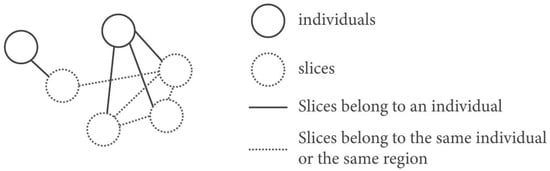 Based on the RT-graph model, using complex network theory, CT images are expressed in a macro manner. Suppose that the CT images can be modeled as an undirected, unweighted graph at the region level. The graph can be denoted as G = {V, E, A}. V represents the node set of the graph with the number of |V| = N, where N is the number of total samples, and E is the edge set, where the slices representing nodes are connected in the form of a fully connected undirected graph. At the region level, a node corresponds to a slice, and an edge represents the relation between the two slices based on the labeled anatomical prior knowledge (APK) and region information. An edge is generated if two slices belong to the same region, with the same quality between different individuals, or the slices belong to the same individual, as seen in Figure 2, where the solid circle indicates individuals and the dashed circle indicates slices. At the pixel level, the attributes of the graph are obtained based on the complex network [].