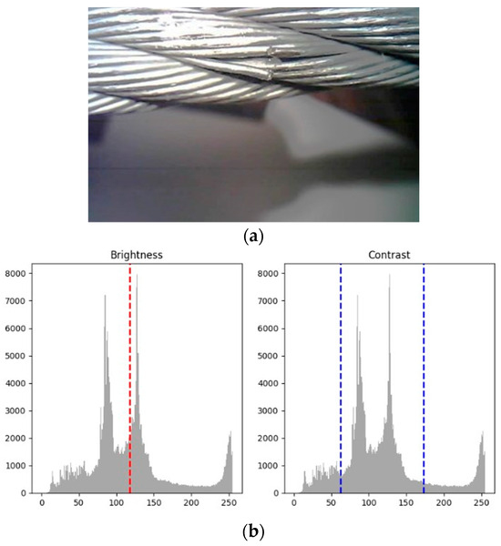 Figure 2. (a) Input image, (b) results of brightness and contrast calculation. Red Dashed Line: In the histogram of brightness, the red dashed line marks the average value of brightness. Blue Dashed Line: In the histogram of contrast, two blue dashed lines mark the range of contrast, i.e., the standard deviation of brightness.