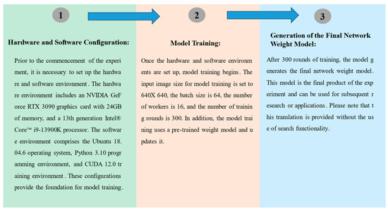 In terms of model training, the size of the input image was set to 640 × 640, the batch size was set to 64, the number of workers was set to 16, and the number of training rounds was set to 300. A pre-trained weight model was used, and the model training was updated based on this. After 300 rounds of training, the model generated the final network weight model. The image-based experimental environment of this paper is depicted in Table 3. Furthermore, as illustrated in Figure 8, the experimental setup used in the research is represented by a detailed flowchart. This diagram clearly outlines the entire process of the experiment, beginning with the hardware and software configurations, followed by model training, and culminating in the generation of the final network weight model. This flowchart aids readers in gaining a deeper understanding of the experimental setup and demonstrates how to achieve efficient computation while maintaining accuracy. This setup ensures the computational efficiency and accuracy of the experiment.