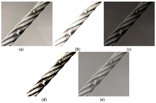 Figure 9. Different expansion effects of overhead power line: (a) original image, (b) high-brightness image, (c) low-brightness image, (d) high-contrast image, (e) low-contrast image.