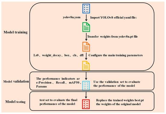 After the model training was completed, a detailed testing process was carried out to evaluate the model’s performance. Here are the steps for testing. First, during the testing process, the model was applied to each image in the test set, and the model’s prediction results were recorded. Then, the model’s prediction results were compared with the actual labels to calculate the model’s performance metrics. For performance evaluation, precision, recall, mAP50, and parameter metrics were used to evaluate and comprehensively reflect the model’s performance. All of the above training, validation, and testing processes can be found in the flowchart in Figure 10. Figure 10 provides a detailed depiction of the entire process, including the inputs and outputs of each step, and how they are interconnected.