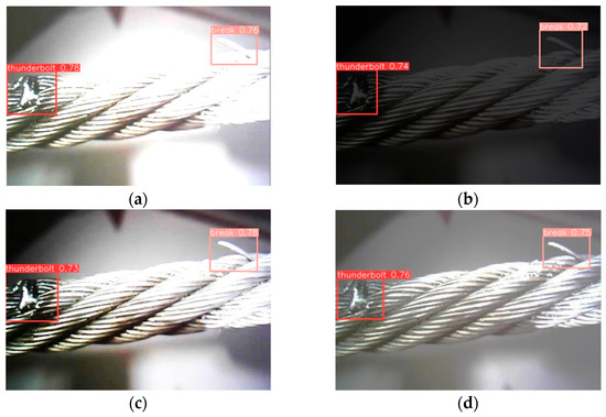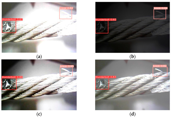 Figure 11. Detection results of the original YOLOv8 model under different environments: (a) High Brightness, (b) Low Brightness, (c) High Contrast, (d) Low Contrast.