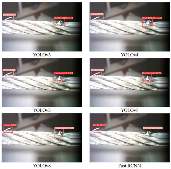 As illustrated in Figure 13, the test results of different models on RoboFlow’s Cable Damage Detection dataset indicate that these models are more accurate in detecting breakage and thunderbolt than other models. This demonstrates that these models exhibit certain efficiency and stability when processing large-scale datasets, giving them certain advantages in practical applications.