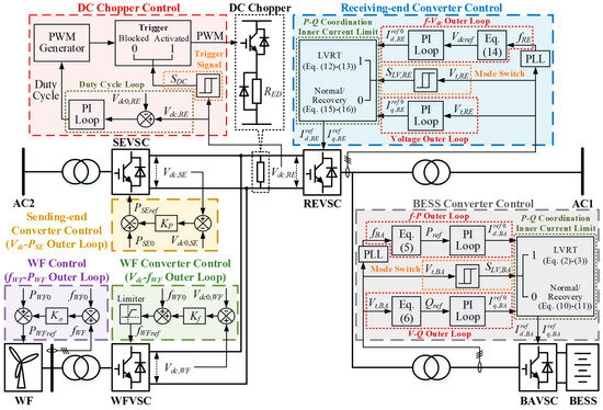The overall control diagram is shown in Figure 2. It can be seen that all the converters and the DC chopper only need local signal measurements (frequency and AC and DC voltages) to be activated. The system’s AC voltage measurement can be used to estimate whether the system is under the LVRT process, and it can also be used as the trigger signal to switch the control modes of each controller in different periods. This paper will mainly focus on the time scale of frequency and voltage regulation; the inner control loops and the PWM generation blocks of certain control blocks in Figure 2 are not discussed, and the typical PI control loop parameters used in [27] are used in the study and shown in Appendix A.