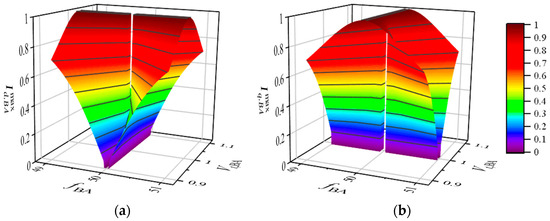 where fBA, f0, Vt,BA, and Vt0 are the measured and rated system frequency and converter terminal voltage values, respectively; fmax and fmin are the maximum and minimum allowable frequency values, respectively; Vtmax and Vtmin are the maximum and minimum allowable voltage values, respectively; and Δfdb and ΔVt,db are the dead-band ranges of the frequency and voltage, respectively. Specifically, if both Mf and MV are 0, M equals 0. Then, the active and reactive current references can be limited, as shown below, and their maximum limitation values, and , changing with fBA and Vt,BA, are shown in Figure 3: