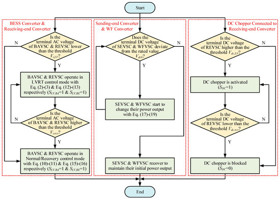 Based on the aforementioned design, the control rules of each equipment can coordinate with each other for frequency and voltage support during the LVRT and recovery processes, and the corresponding algorithm flow chart is shown in Figure 4.