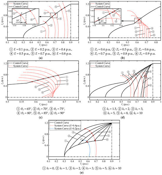 The diagrams of the system Vt-Id characteristics. (a) when the grid voltage drop E changes; (b) when the grid impedance amplitude Zg changes; (c) when the grid impedance angle θg changes; (d) when the proportional coefficient kq changes; (e) when the proportional coefficient kd changes.