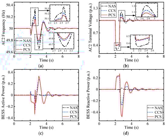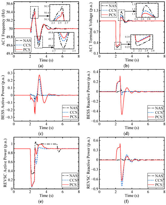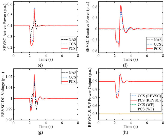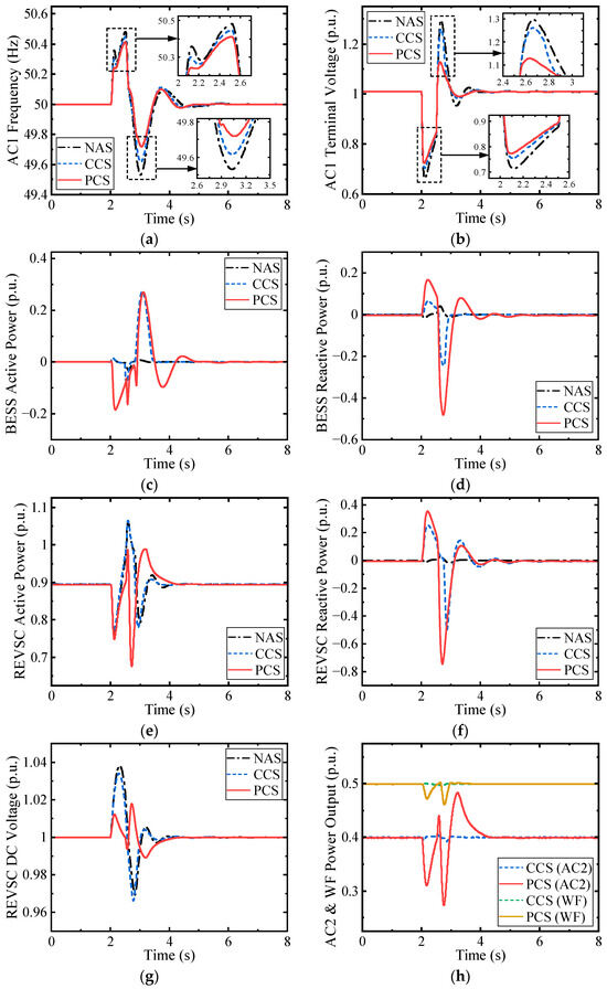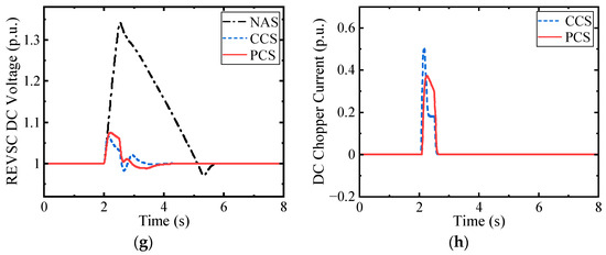 It can be seen from Figure 7a,b that the PCS can provide better frequency and voltage support than the CCS during both the LVRT and recovery processes. It should be noted that, since the fault is remote to the converter terminal, the voltage drop is not quite deep, so the REVSC active power transmission is not seriously affected. Hence, the power imbalance in the DC link does not lead to the DC voltage exceeding 1.05 p.u., as shown in Figure 7g, and power reduction is not activated from the sending-end systems nor the DC chopper under the CCS. On the contrary, it can be seen from Figure 7h that, under the PCS, AC2 and the WF will change the power output when the DC voltage changes in the LVRT process, so the imbalanced power can be reduced to some extent, and the DC voltage deviation can be suppressed. Meanwhile, during the recovery process, the DC voltage can further transmit frequency information, and AC2 and the WF can then participate in frequency support.