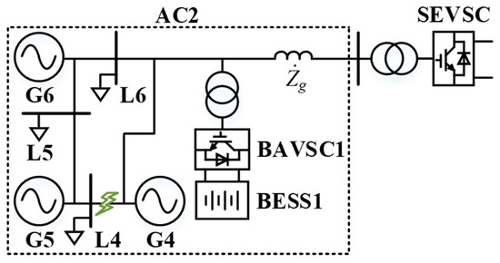 The efficacy of the proposed control strategy for LVRT and its recovery when a grid fault occurs in the receiving-end system has been validated. In fact, the control rules of the receiving-end converter during the LVRT and recovery processes can also be adopted in the sending-end converter. To carry out the validation, the AC2 sending-end system can be modified, as shown in Figure 8, which consists of SGs G4–G6, load nodes L4–L6, and a local BESS1 connected with BAVSC1, and their parameters are the same as that of the SGs G1–G3, load nodes L1–L3, and BESS in AC1, respectively, as shown in Table A2. The control rules (12), (13), (15), and (16) and the hysteresis comparator for mode switch in REVSC have been adopted in SEVSC, and the control strategy for BAVSC has also been adopted in BAVSC1. A three-phase grounding fault occurs between G4 and L4 in Figure 8 at t = 2 s, and the fault is cleared after 0.5 s. The system response results under different control strategies are plotted in Figure 9.