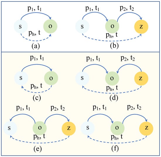 Figure 3a,b show the general pattern of rules with a length of 1 and 2, respectively, which can be inferred through chain propagation. Figure 3c–f show other patterns of links. To mine temporal logic rules using such links, we add inverse relations to mine potential temporal logic patterns.
