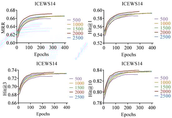 In this study, we investigated the impact of embedding dimensions on the TKG reasoning method based on embedding representation, where entities, relations, and timestamps are embedded into a low-dimensional vector space for link prediction tasks. While higher embedding dimensions can improve model performance, excessively high dimensions can also increase the computational cost. To examine the influence of embedding dimensions, with a batch size of 1000, an RGNN embedding dimension of 250, a learning rate of 0.1, and a rule confidence threshold of 0.2, we conducted comparison analyses on the ICEWS14 dataset. Except for the embedding dimension, all other parameters remained unchanged. According to the experimental results, as illustrated in Figure 4, the model’s performance increases with increasing embedding dimensions—that is, until a certain point, at which point it begins to decrease. As Figure 4 shows, the embedding dimension is fixed at 2000.