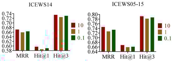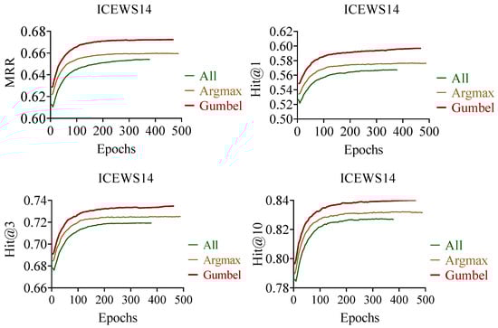 In the comparative analysis of temporal rule sampling methods, the Gumbel-softmax method can flexibly sample the appropriate rules, the Argmax method selects the rules with maximum confidence, and the third method uses all the rules; the experiment was performed on the ICEWS14 dataset. As can be seen in Figure 5, the training evaluation curve of the Gumbel-softmax method has been kept the highest, and as a result, it can be confirmed that this study utilizes differentiable sampling effectively.