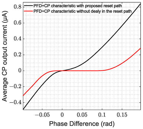 PFD-CP chain characteristic with proposed reset path design (black) and without delay in the reset path (red).