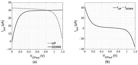 In Figure 8, the DC characterization of the CP is shown for a nominal output current of 40 µA. Particularly, in Figure 8a, the UP and DOWN currents measured in the first two configurations, as described in the previous section, are reported. As can be seen, the two currents were matched in the 0.3–0.9 V voltage range, where the output impedance is very high. Indeed, this is well observable in Figure 8b, where the measured total output current is plotted. As expected, this current approached 0 in the range of 0.3–0.9 V. From this figure, the output impedance can also be derived as 155 kΩ in the middle of the output voltage range.