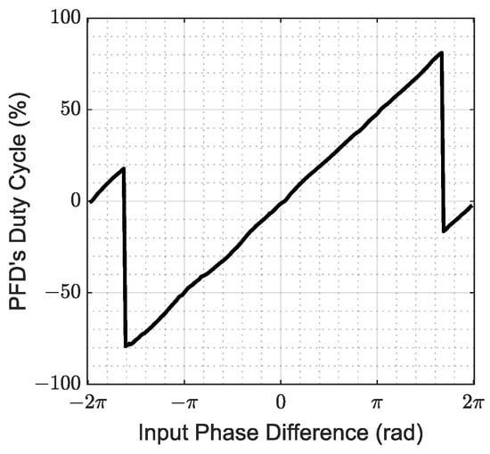 In Figure 9, instead, the derived PFD characteristic is plotted. It was symmetric for positive and negative phase differences, as was expected from the symmetry of the architecture. No dead-zone was present, as can be seen near the zero-phase difference, while, at the edges, the blind-zone is well visible, and it resulted as 0.94 rad, which corresponds to about 950 ps. Because of the blind-zone, phase differences near the ±2π could not be seen by the PFD, which was in its reset state upon the new edge of the leading signal. Because of this, the edge did not produce any effect, and the following edge of the non-leading signal was seen as the leading one. Consequently, the PFD moved from the reset state into the wrong state, corresponding to a near-zero phase difference. The resulting gain was 0.156, near the ideal one of 1/2π.