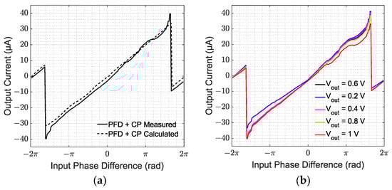 Figure 10a shows the measured, average output current of the PFD and CP together as a function of the phase difference between the PFD input signals, with 0.6 V forced on the output node (solid line). Ideally, the characteristic resulting from the cascade of the PFD and the CP should be equal to the PFD characteristic multiplied by the UP and DOWN CP currents. This ideal characteristic is also plotted in Figure 10a (dashed line), and was derived from the measured PFD and CP characteristics. As can be seen, there was a slight difference between the ideal and measured results, which was mainly due to the transient behavior of the CP. Indeed, the average current also depended on how the CP behaved when it switched ON and OFF, and on the matching between the UP and DOWN currents during these switching periods.