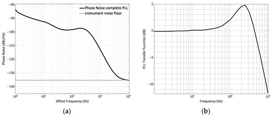 (a) Phase noise measurement of the complete PLL where the proposed CP and PFD were integrated. The measurement was carried out by exploiting a Rohde and Schwarz FSL18 Spectrum Analyzer (Rohde & Schwarz, Munich, Germany), whose noise floor is reported in the figure. (b) Phase transfer function of the complete PLL where the proposed CP and PFD were integrated. The measurements were performed by exploiting a MSO72304DX Tektronix Oscilloscope (Tektronix, Beaverton, OR, USA).