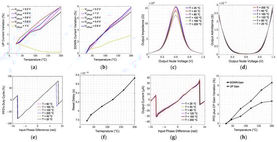 PFD and CP thermal characterization: percentage DC DOWN current variation in (a); percentage DC UP current variation in (b); CP’s output impedance in (c); CP’s output admittance in (d); PFD characteristic in (e); propagation delay of the PFD’s reset pa path in (f); PFD plus CP cascade characteristic in (g); PFD plus CP cascade’s UP and DWON gain percentage variation in (h).